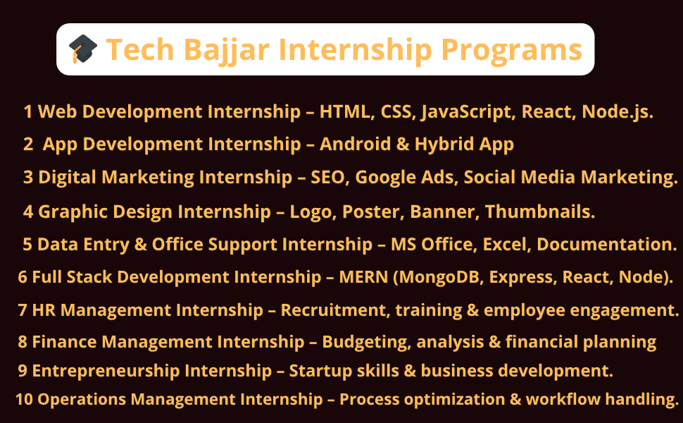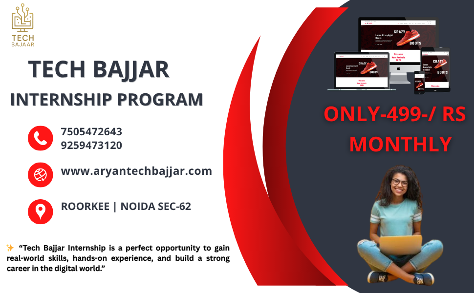 TECH BAJJAR INTERNSHIP PROGRAM IS DESIGNED TO PROVIDE STUDENTS AND FRESHERS WITH REAL-WORLD EXPERIENCE AND PRACTICAL KNOWLEDGE. WE OFFER HANDS-ON TRAINING IN WEB DEVELOPMENT, APP DEVELOPMENT, DIGITAL MARKETING, GRAPHIC DESIGN, MANAGEMENT, AND MANY MORE FIELDS. OUR INTERNSHIPS HELP YOU LEARN INDUSTRY-READY SKILLS, WORK ON LIVE PROJECTS, AND BUILD A STRONG PORTFOLIO. AT TECH BAJJAR, WE FOCUS ON GROWTH, INNOVATION, AND CAREER DEVELOPMENT TO PREPARE YOU FOR FUTURE SUCCESS. JOIN US TO SHAPE YOUR CAREER WITH THE BEST GUIDANCE AND SUPPORT.